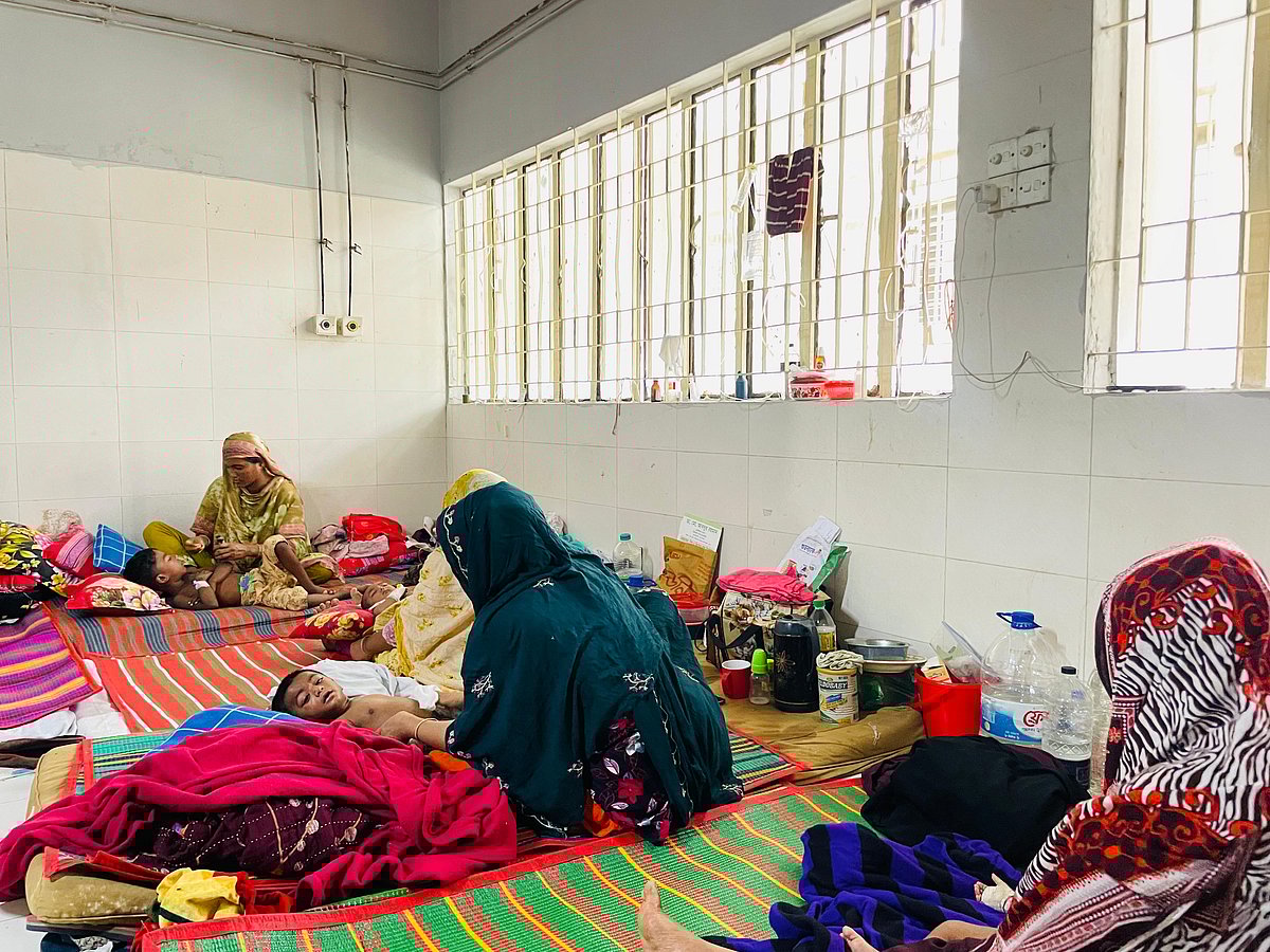 মঙ্গলবার বেলা ১১টার দিকে হাসপাতালের মূল ভবনের নিচতলার ২ নম্বর ওয়ার্ডে গিয়ে দেখা যায়, মানসিক চিকিৎসা ওয়ার্ড এখন শিশু বিভাগের জন্য ব্যবহার করা হচ্ছে। করিডোরজুড়ে মেঝেতে চাটাই বিছিয়ে শিশুদের চিকিৎসা দেওয়া হচ্ছে। ওয়ার্ডের ভেতরে কয়েকটি শয্যা থাকলেও অধিকাংশ শিশুর ঠাঁই হয়েছে মেঝেতে। ওই ওয়ার্ডের একটি ছোট কক্ষকে আইসোলেশন বা বিচ্ছিন্নকরণ ইউনিট হিসেবে ব্যবহার করা হচ্ছে। সেখানে হামে আক্রান্ত ও উপসর্গ নিয়ে ভর্তি শিশুদের রাখা হয়েছে। আনুমানিক ২০০ বর্গফুটের একটি কক্ষে ১৭ শিশুর চিকিৎসা চলছে, তবে সেখানে কোনো শয্যা নেই। ফলে গাদাগাদি পরিবেশে মেঝেতেই চিকিৎসা নিতে হচ্ছে শিশুদের। এতে ভোগান্তিতে পড়েছেন তাঁদের মা-বাবা ও স্বজনেরা।