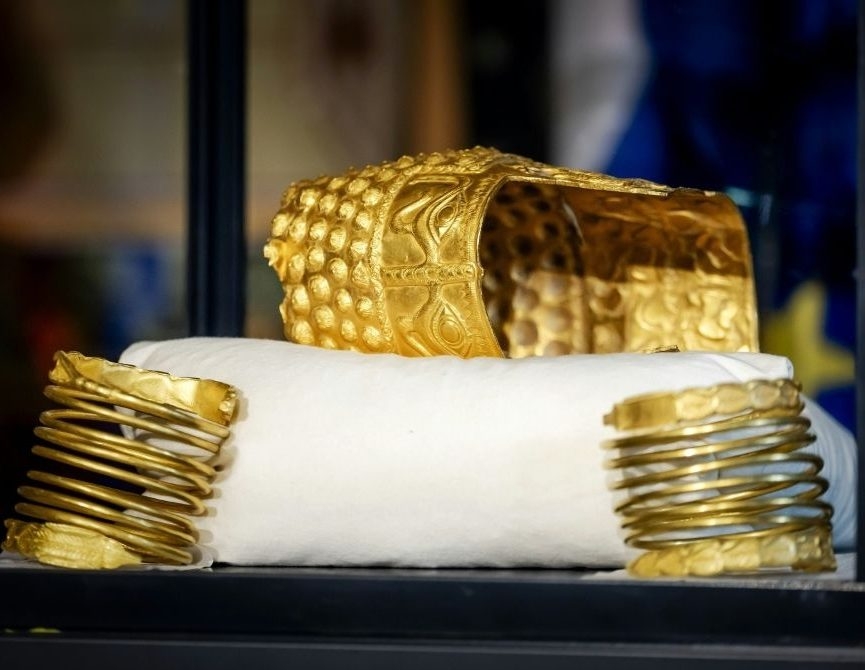 Flanked by balaclava-clad police officers, a spokesman for Dutch prosecutors unveiled the 5th-century BC golden Helmet of Cotofenesti and two of the three gold bracelets stolen in January 2025.